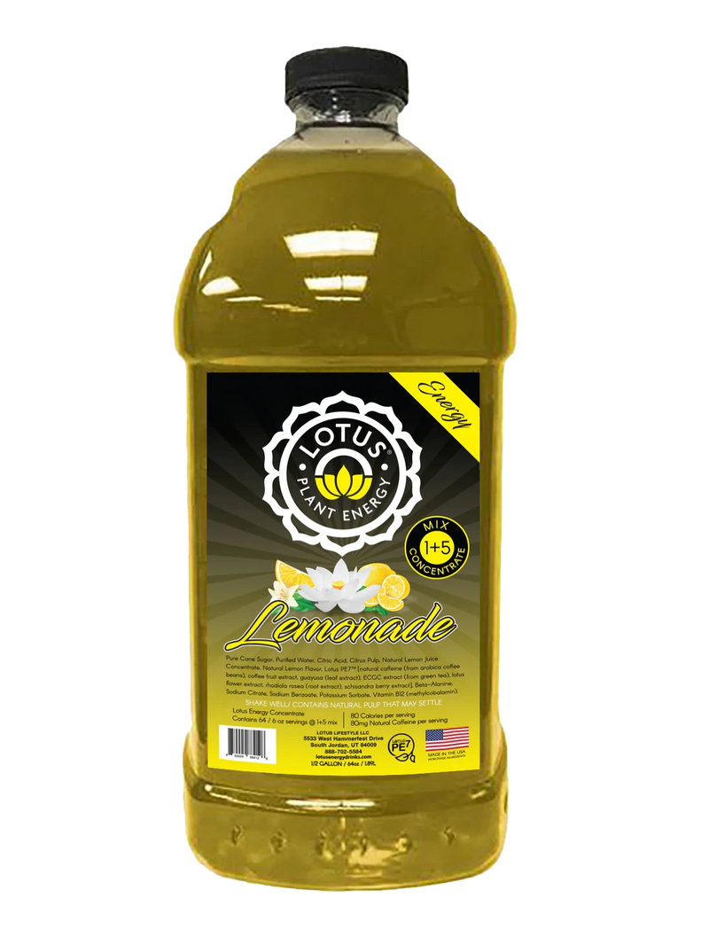 Lotus Energy Lemonade contains caffeine and is made with real lemons! 25% stronger than market leading energy drinks! Featuring Adaptogenic botanicals, amino acids, B-vitamins, natural caffeine from (green tea), and sweetened with pure cane sugar. Mixes with all your favorite flavored syrups for world's best energy spritzers. Efficient pump dispenser at half the price of artificial/synthetic canned energy drinks.